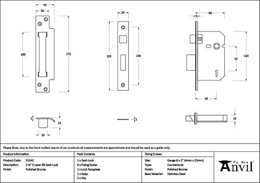 Polished Bronze 2½" 5 Lever BS Sash Lock