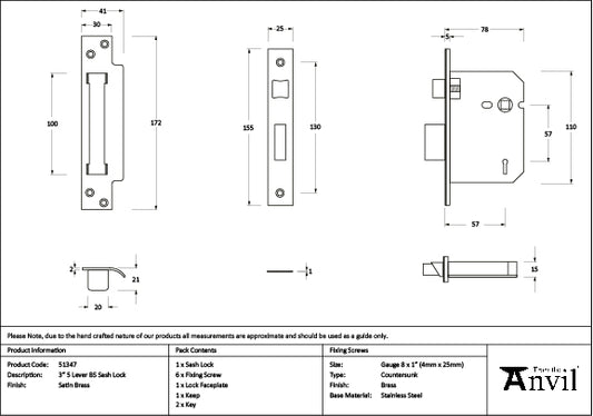 Polished Bronze 3" 5 Lever BS Sash Lock