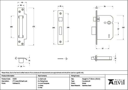 Polished Nickel 3" 5 Lever BS Sash Lock