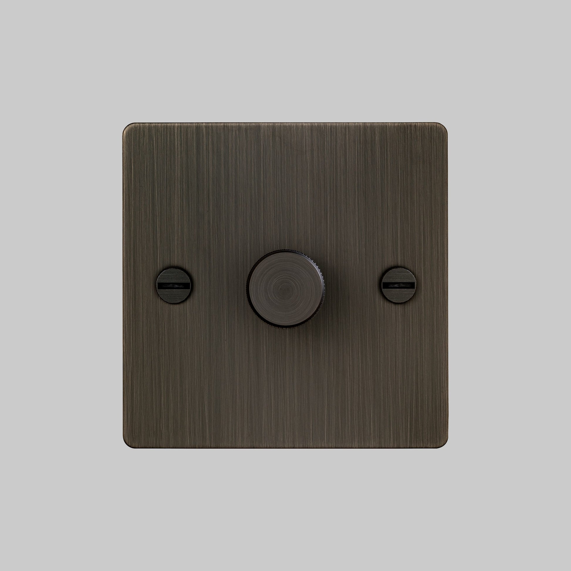 A 1G dimmer switch finished in smoked bronze and comes with a choice of solid metal detail kits. The detail kit includes a dimmer knob and coin screws, available in smoked bronze or brass.