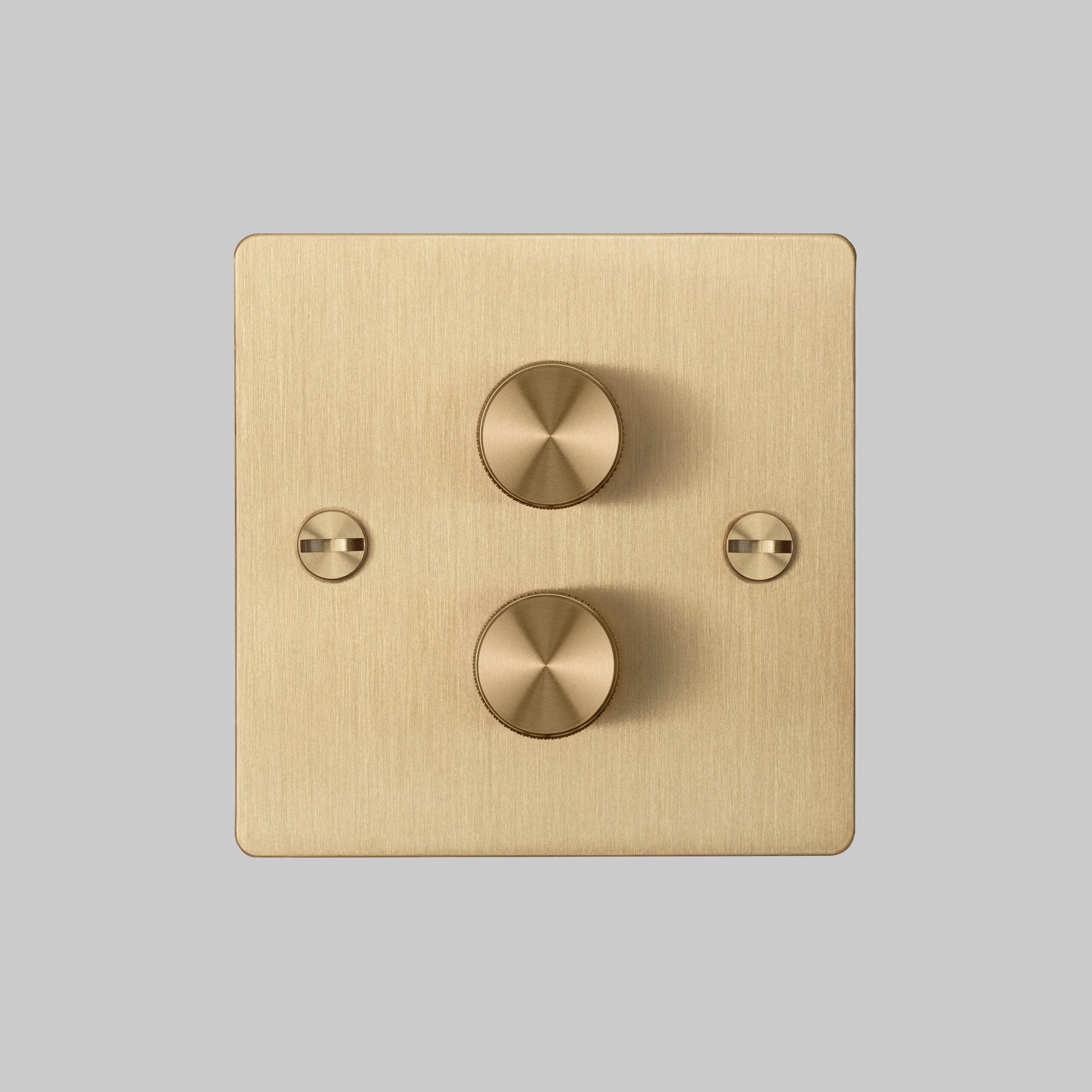 A 2G dimmer switch finished in brass. The dimmer knob features our signature, diamond-cut, cross-knurl pattern and is made from solid brass.