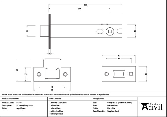 Tube Size: 128mm (L) x 23mm (H) x 15mm (T) Backset: 107mm Forend Size: 60mm (L) x 25mm (w) Strike plate: 65mm (L) x 40mm (W)