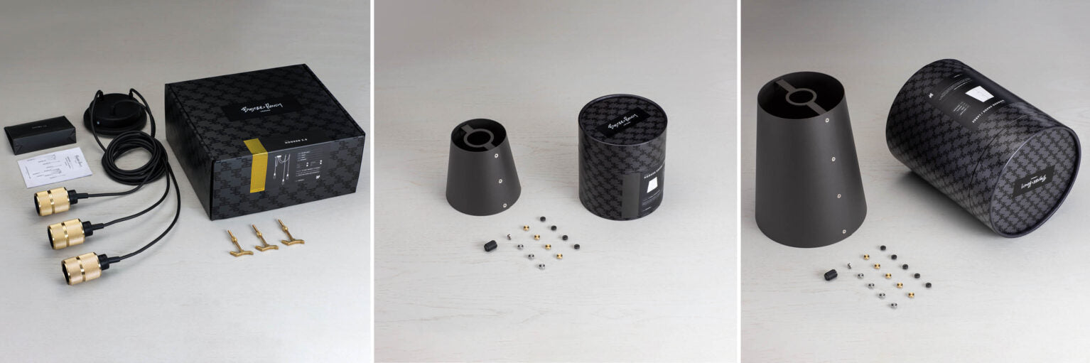A chandelier made up of three light pendants, each with their own customising hook, and matte rubber detailing. This light is available with STEEL, BRASS or SMOKED BRONZE pendants.