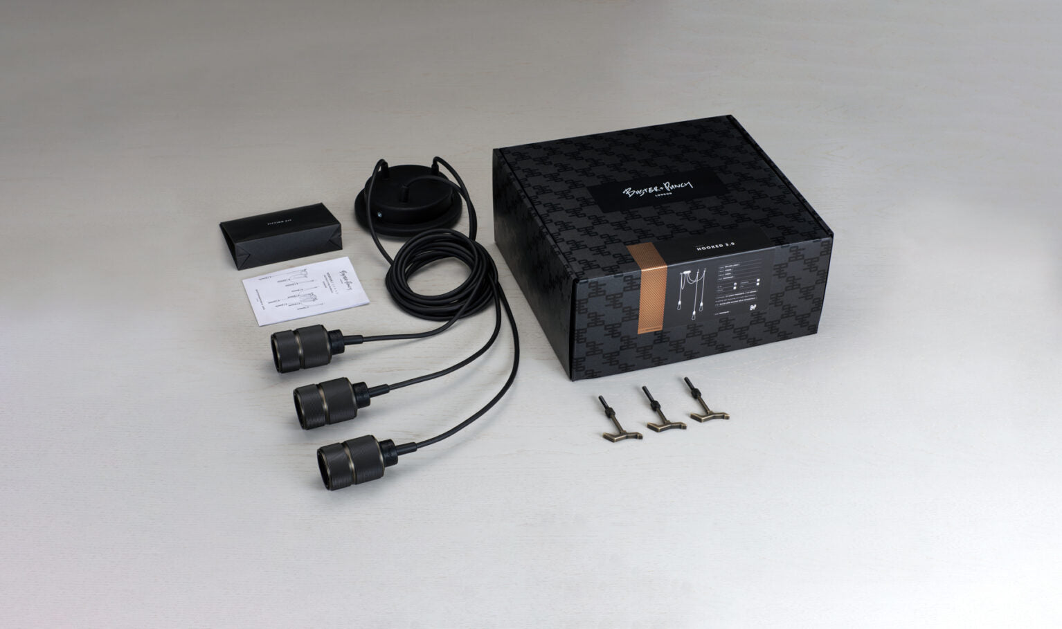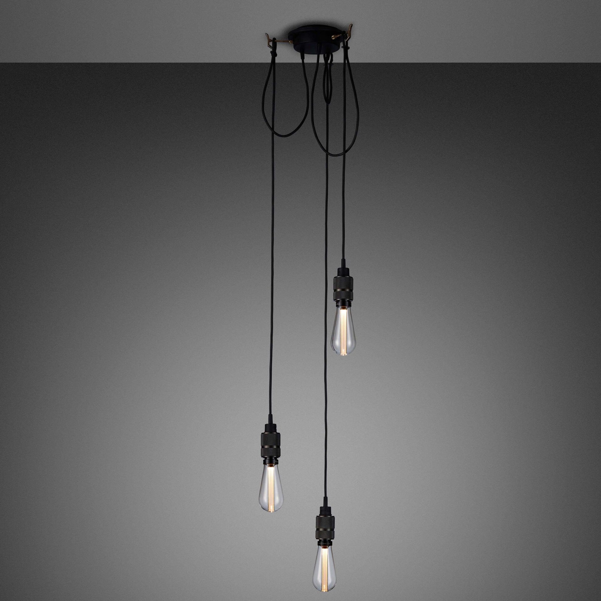 A chandelier made up of three light pendants, each with their own customizing hook, and matte rubber detailing. This light is available with STEEL, BRASS or SMOKED BRONZE pendants.